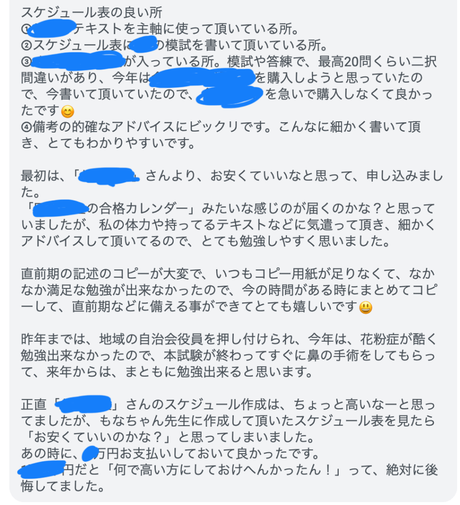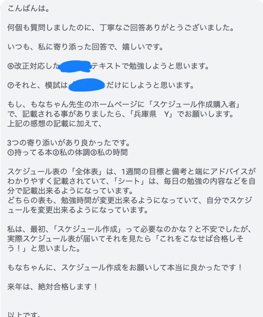 私自身は完全にゼロから情報収集し、合格をしましたが、それにかかった時間的コストや経済的コスト、心理的な不安を振り返ると、合格経験者のスケジュール作成があるのとないのとでは、学習効率に雲泥の差があるように思います。