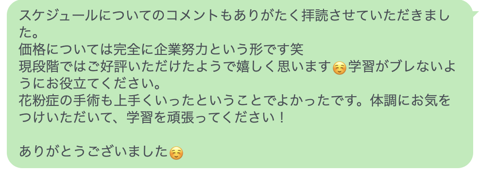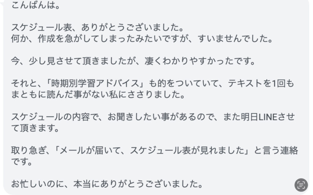 ※スケジュール納品までの間に勉強を進めたい場合はその旨をお伝えいただければ、その間の学習内容をアドバイスいたしますので、お急ぎの方もご安心ください。