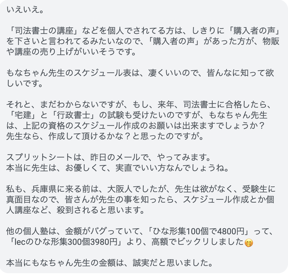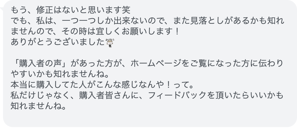 中でもありがたいコメントをいただいたのでご紹介します。指導をする側にとって嬉しいのは何よりもフィードバックです。もっと商売上手になりたい。